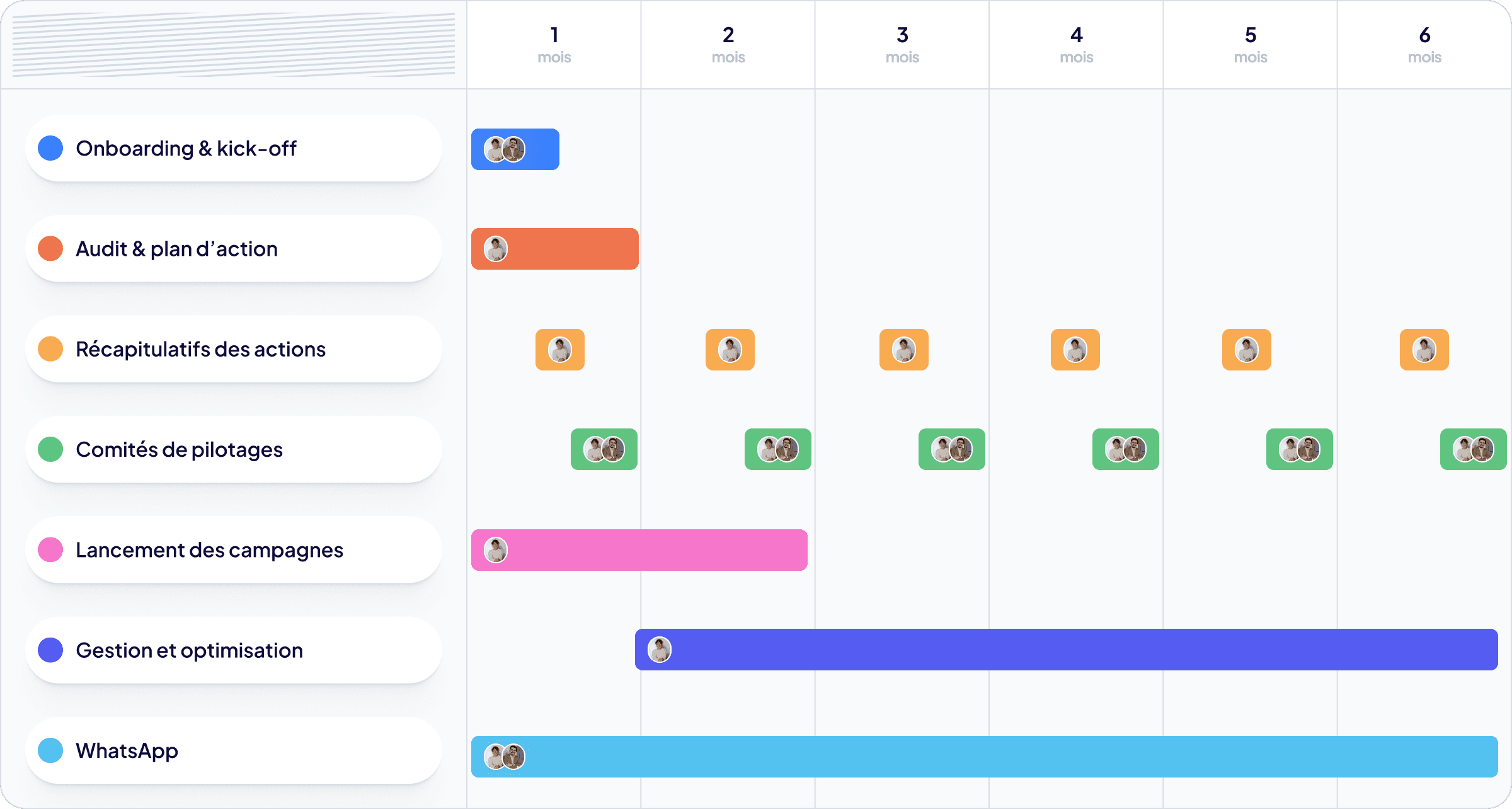 Onboarding & kick-off stratégique, Roadmap claire, Points de pilotage réguliers, Décisions basées sur les données, Ajustements continus. Tout est réglé au millimètre.